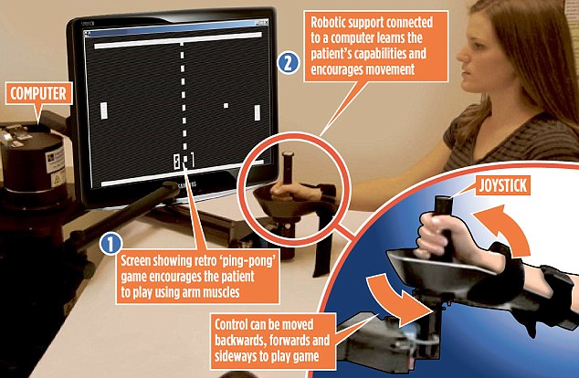 Movement is being restored to the arms of patients paralysed by stroke – thanks to a robot physiotherapist and a retro ‘bat- and-ball’ computer game. The method gives new hope to the 110,000 British victims who are left with difficulty moving hands, arms and shoulders due to brain damage after a stroke. Robot-assisted rehab is a growing field of medical treatment. Usually the ‘robot’ takes the form of a kind of support that is worn in some way by the patient. The robot helps by ‘reading’ what the patient can and can’t do, and learns how and when to give support.
